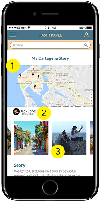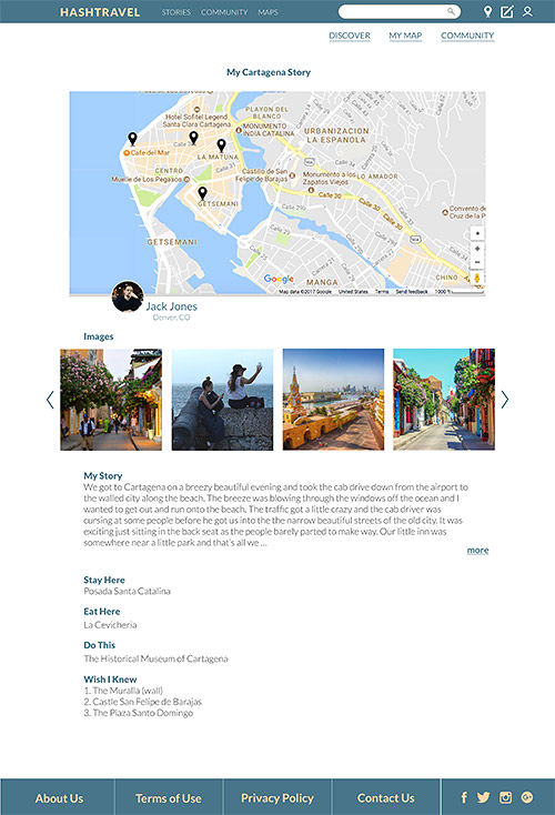 The stories are the key to the experience. So when the user gets to them they need to be attractive, with a proper balance of text, map, and photos. The new story platform we designed allows and encourages content creators to add all of those elements, and to think of their story as a multimedia blog entry. 1. The map is populated with locations/ keywords entered into the story. 2. The traveler who wrote the story is featured with a name and photo linking to his/ her profile page. 3. The traveler's photos of the location are featured below the map and above the written story.