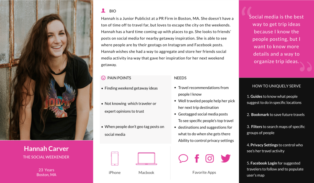 Interviews with insightful people guided us in our reimagining of HashTravel. To help focus our thinking for the rest of the project we created personas of our primary and secondary users. We decided that our primary user had to be a proud, avid traveler, because content creators will be the most valuable users of the app. The secondary user would be the also-essential casual traveler and seeker of advice and ideas.