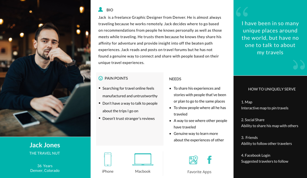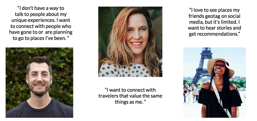 Our 7 in-depth user interviews were illuminating. Avid travelers told us proudly about their travels and how they lacked a dedicated platform from which to tell their stories and give advice to others. Other travelers were excited to see that advice.