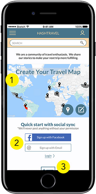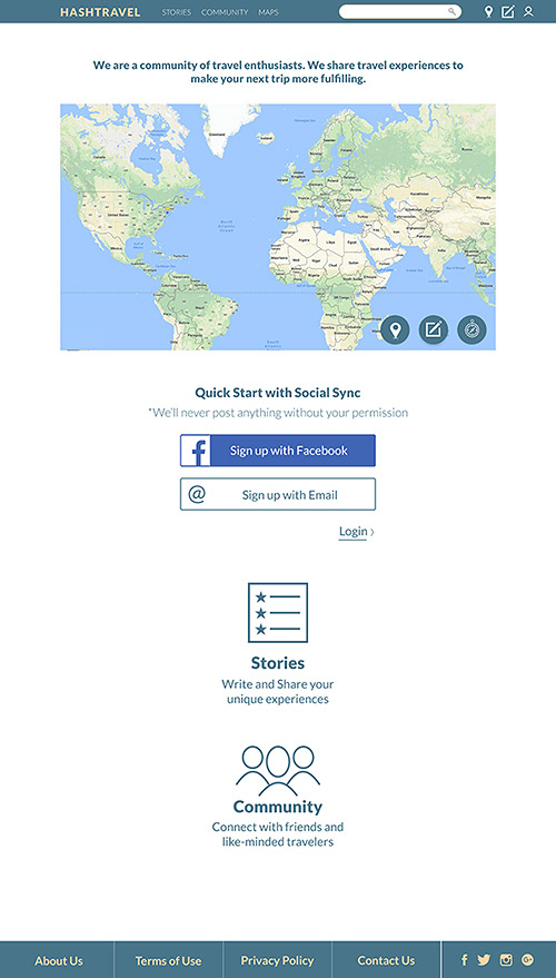 Our test users had been confused about what kind of site they were landing on. This was unacceptable, so we laid out a new design that communicates the core mission. You can create your own travel map, tell stories, join a community. You can jump-start your travel map by signing up through Facebook. The new design will onboard users faster and get them creating and/or exploring content. 1. First-time users are urged to create their own travel map like the example map that's featured. 2. Facebook signup is prominently featured to encourage users to link HashTravel to their social network. 3. Below the fold, additional clickable features are displayed, including Stories and Community.