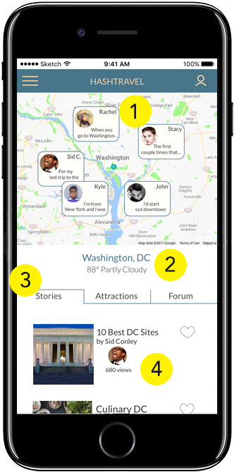 On the new City pages there are several ways for users to explore, and it's all based on the experiences and stories of travelers who have come before. We designed to meet the needs of travelers with stories to tell and their audience of hopeful future travelers. 1. The map at the top of the screen organizes user stories geographically. More local stories will display when the map is zoomed in. 2. Current weather data is displayed below the city name. 3. Popular stories, top attractions, and user forum for that city are all available in tabs. 4. The stories list features an image, title, author, and number of views.