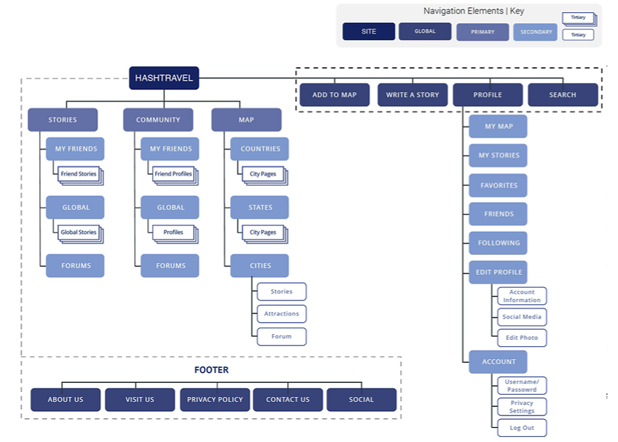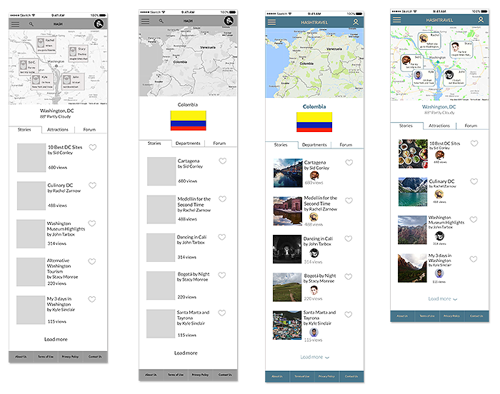 Bringing together all of the information we gathered, we created a new structure for HashTravel. Our tools were whiteboards, notebooks, and many Sketch artboards. We were dealing with an app and a user flow of complexity and we needed to make sure that our most important user experience (sharing travel stories) did not get lost in the structure.